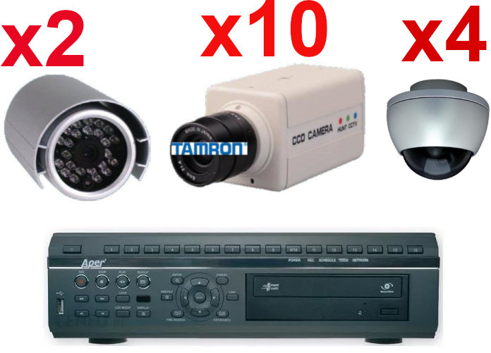Analogowy zestaw monitoringu składający się z rejestratora i 16 kamer. Sprzęt nowy – “leżak magazynowy”.